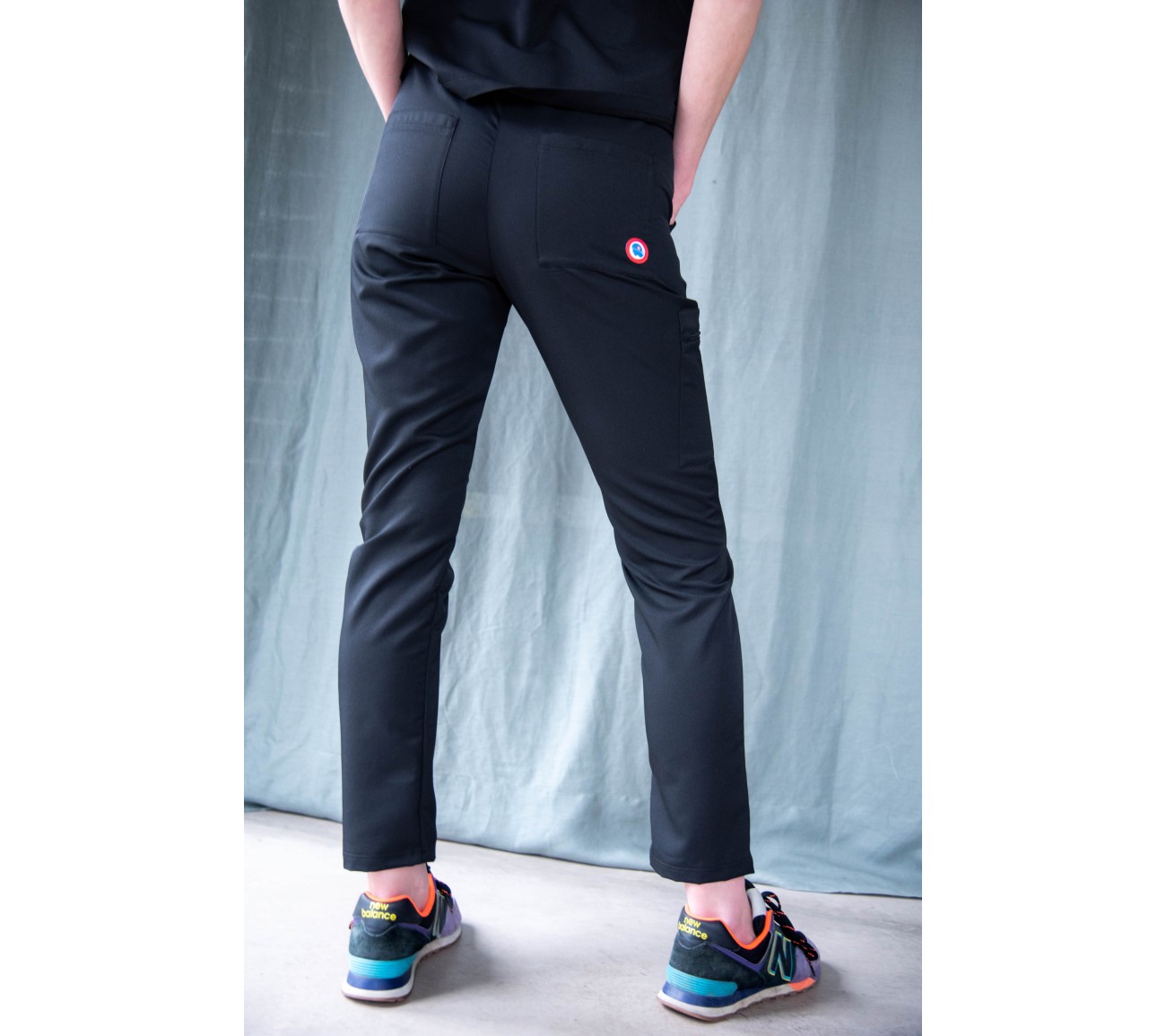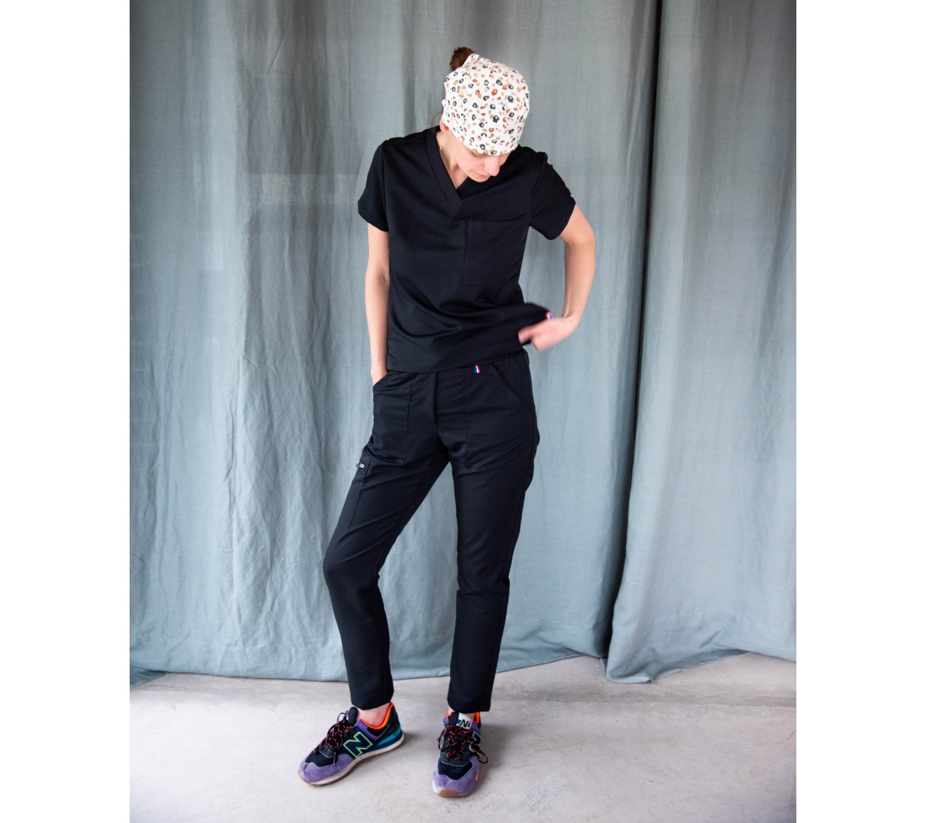 - Tenue Bleu Océan : Anne-Lise fait 1m83, et porte un pantalon taille M. Elle porte habituellement du 40. Elle est à l'aise pour travailler en position assise au cabinet et apprécie le petit côté stretch.