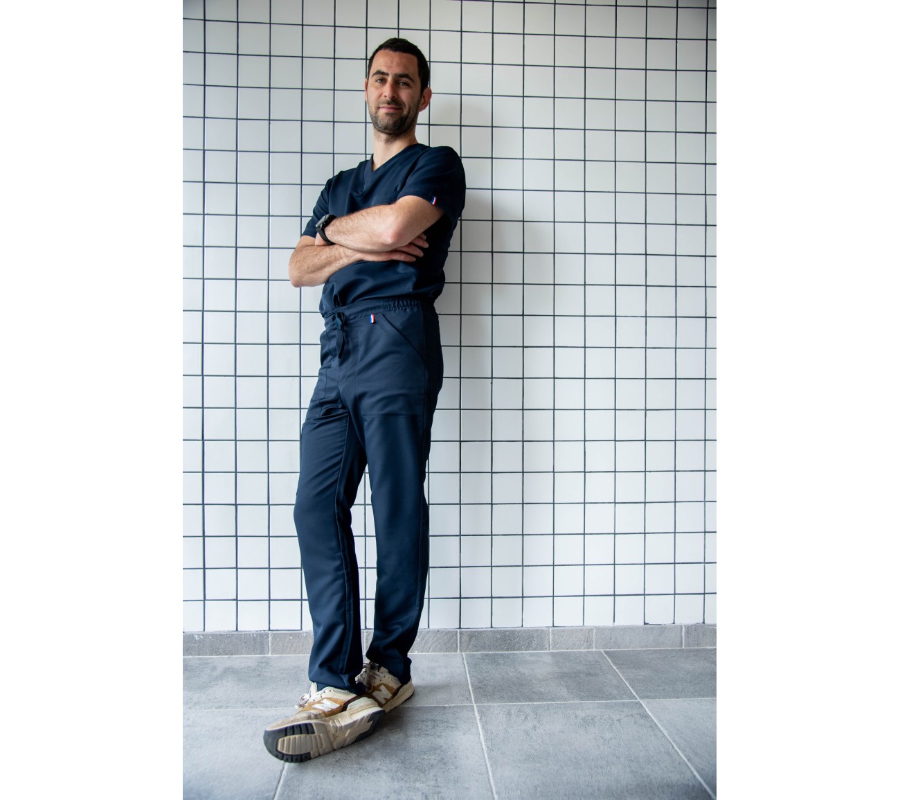 - Tenue Bleu Océan : Théophile et Sébastien, qui sont cardiologue et médecin gé, mesurent entre 1m85 et 1m88, et portent une taille L en pantalon sur la photo. Ils portent leur taille habituelle et se sentent à l'aise pour travailler au bloc et au cabinet.