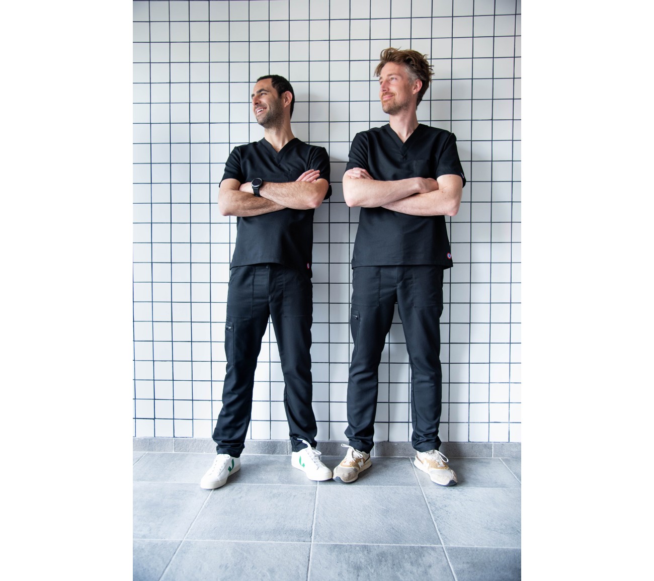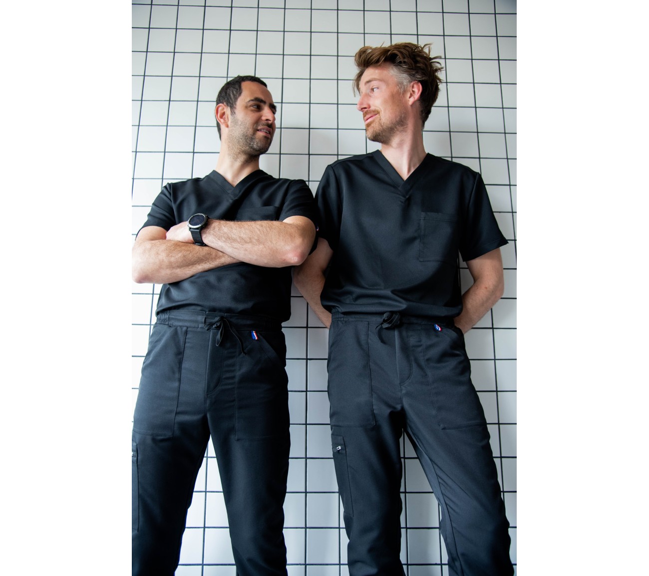 - Tenue Bordeaux : Théophile et Sébastien, qui sont cardiologue et médecin gé, mesurent entre 1m85 et 1m88, et portent une taille L en pantalon sur la photo. Ils portent leur taille habituelle et se sentent à l'aise pour travailler au bloc et au cabinet.