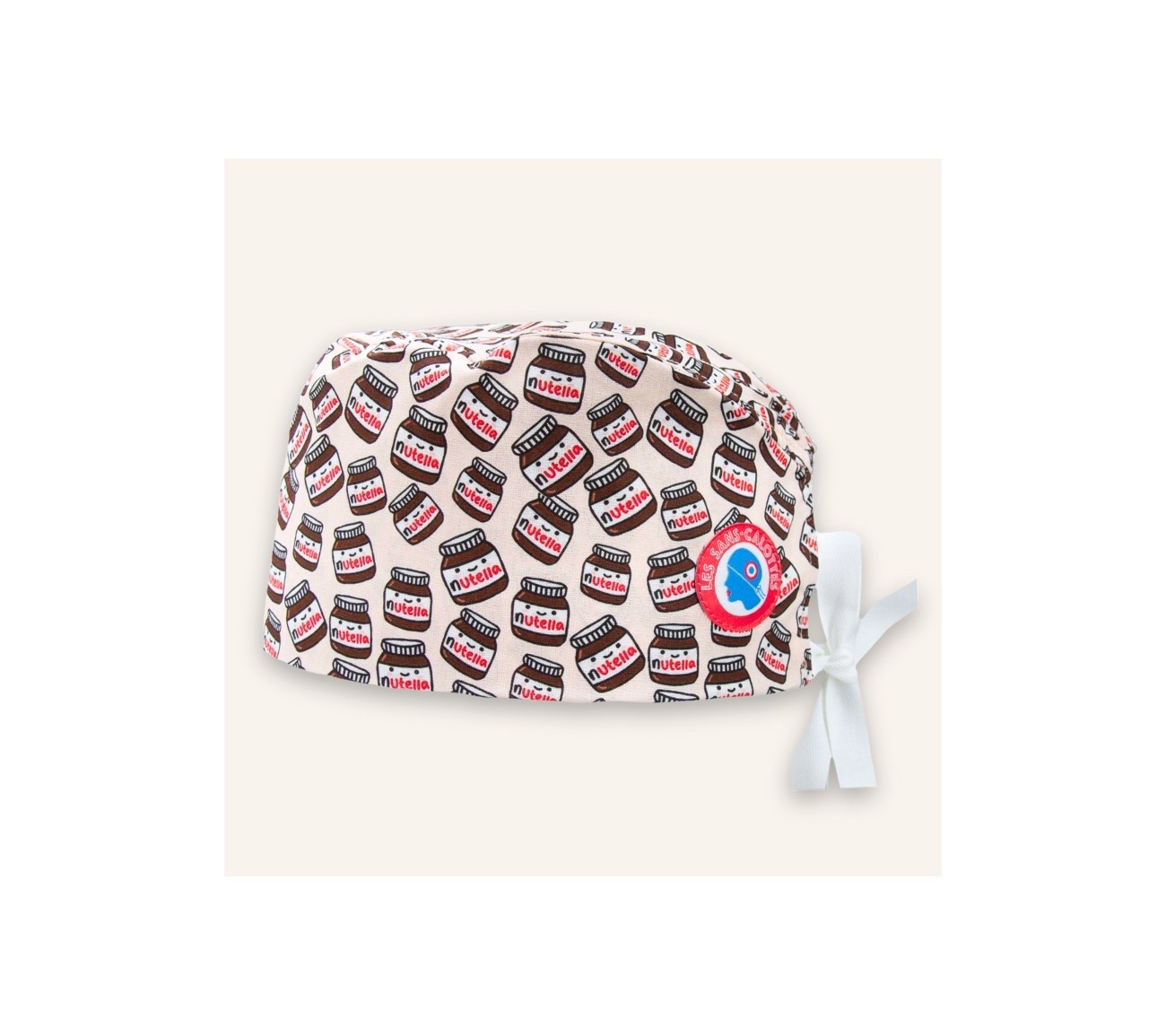Calot en coton beige aux motifs de pots de la célèbre pâte à tartiner choco noisettes