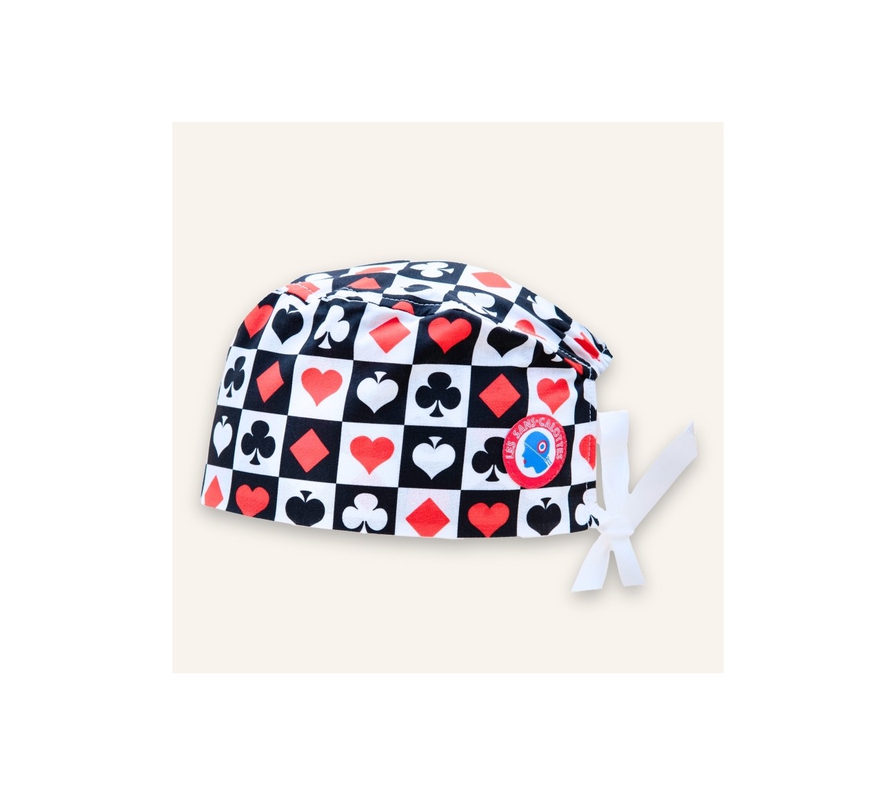 Calot en coton blanc et noir aux motifs rappelant le casino : carreaux, cœurs, pics et trèfles