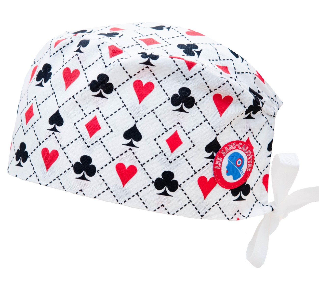 Calot en coton blanc aux motifs rappelant le casino : carreaux, cœurs, pics et trèfles