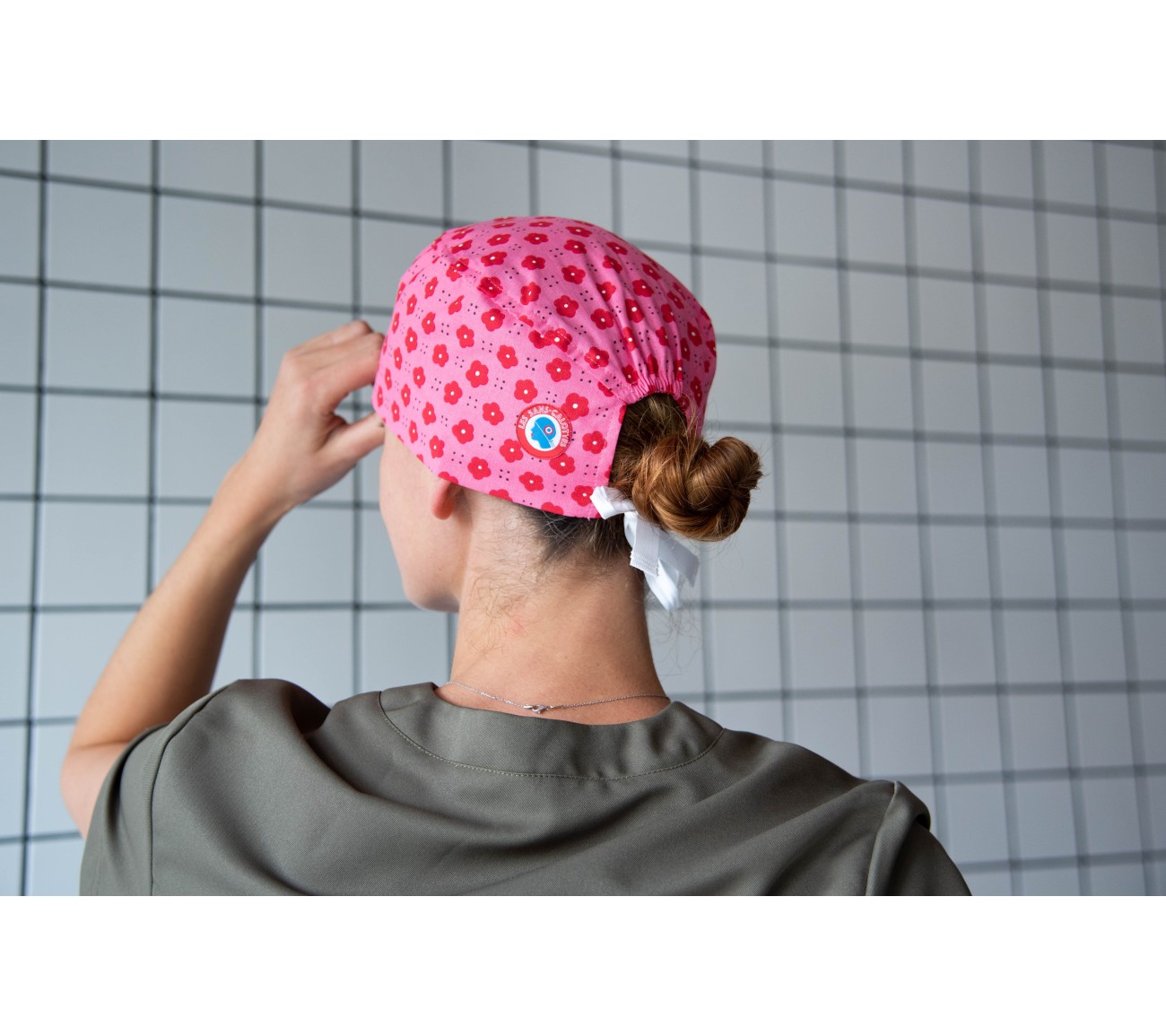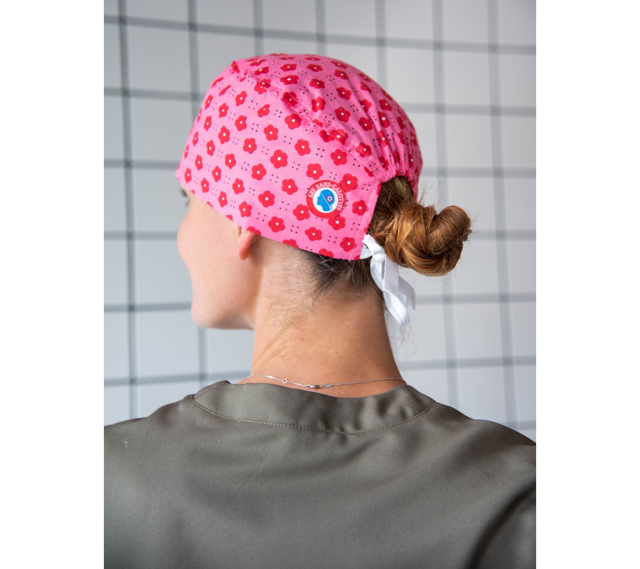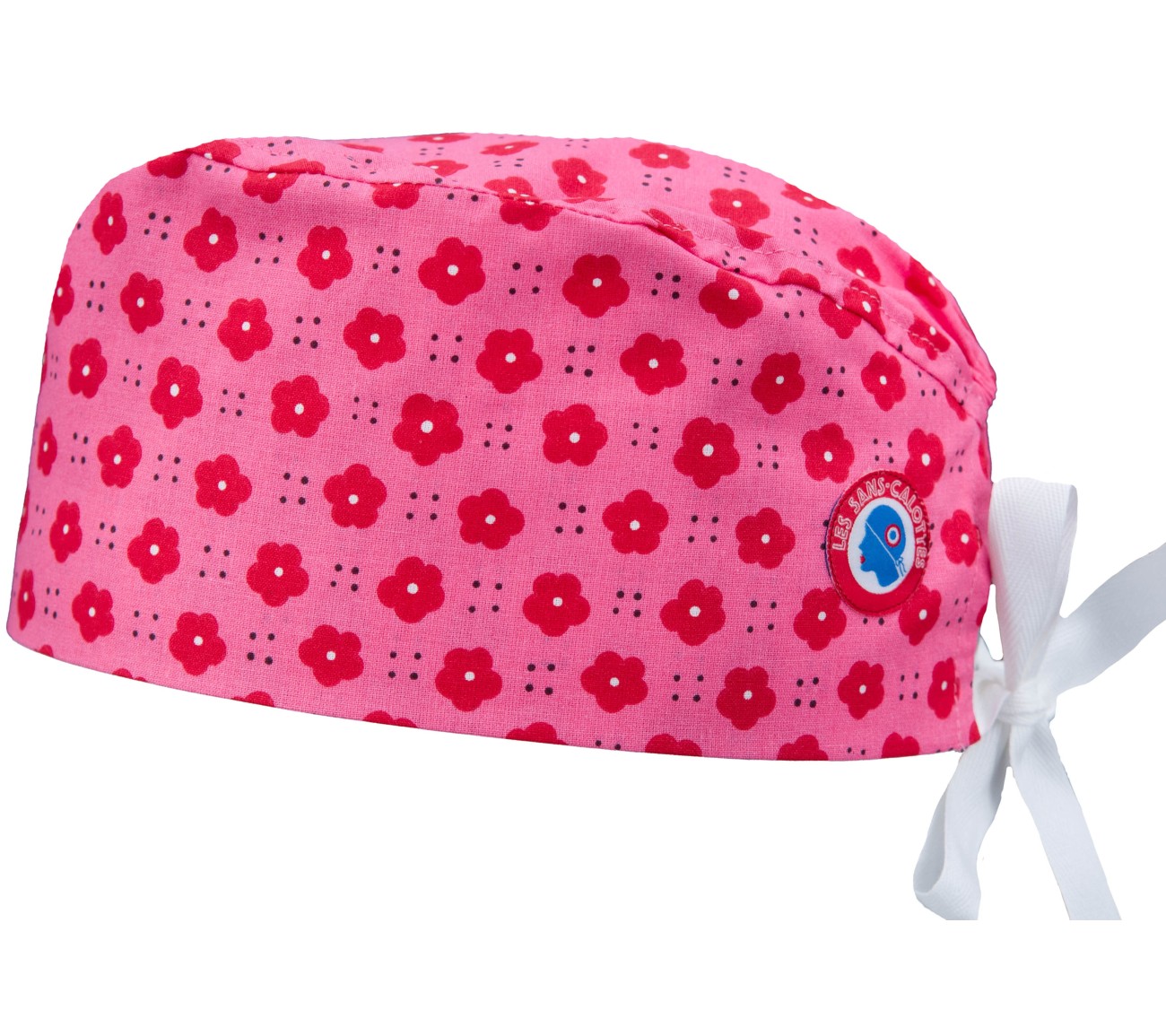 Calot en coton rose aux motifs de fleurs rouges