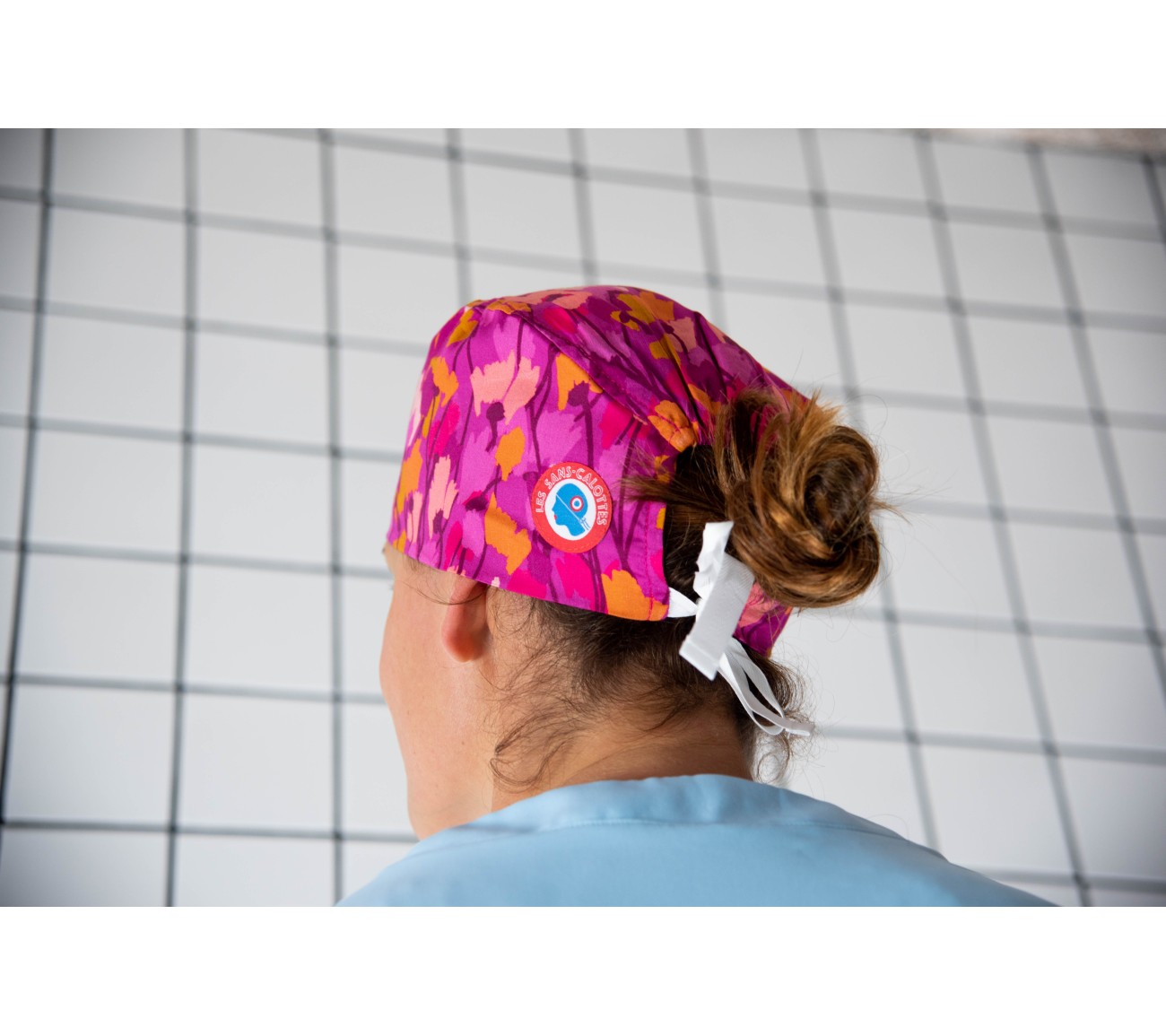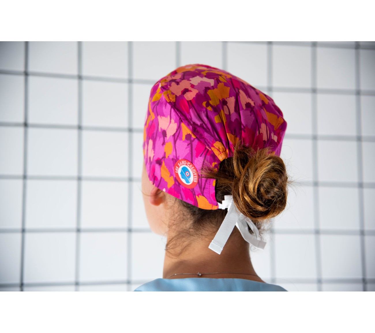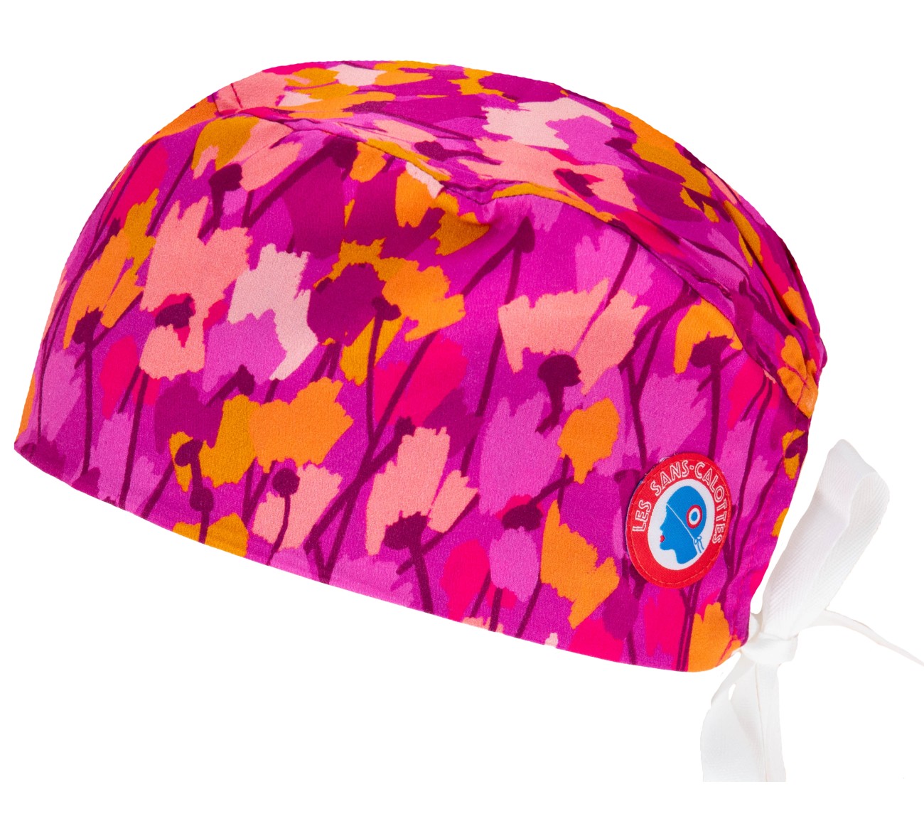 Calot en coton rose d'exception aux motifs fleuris roses et oranges
