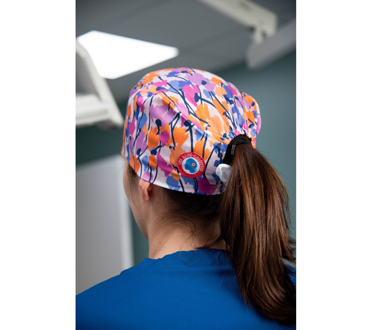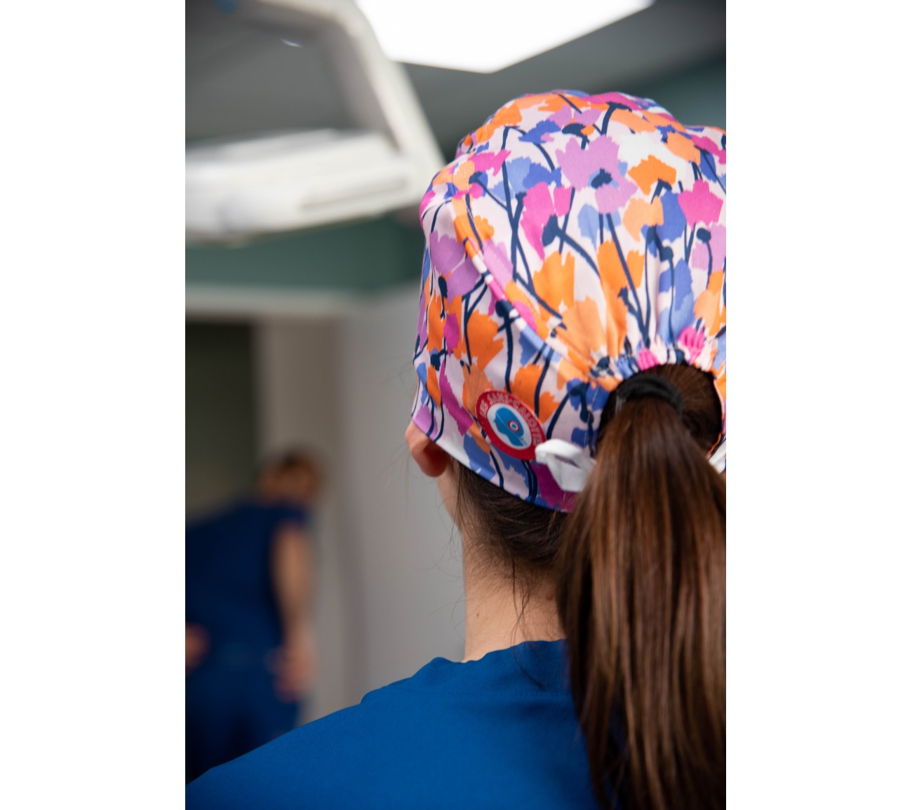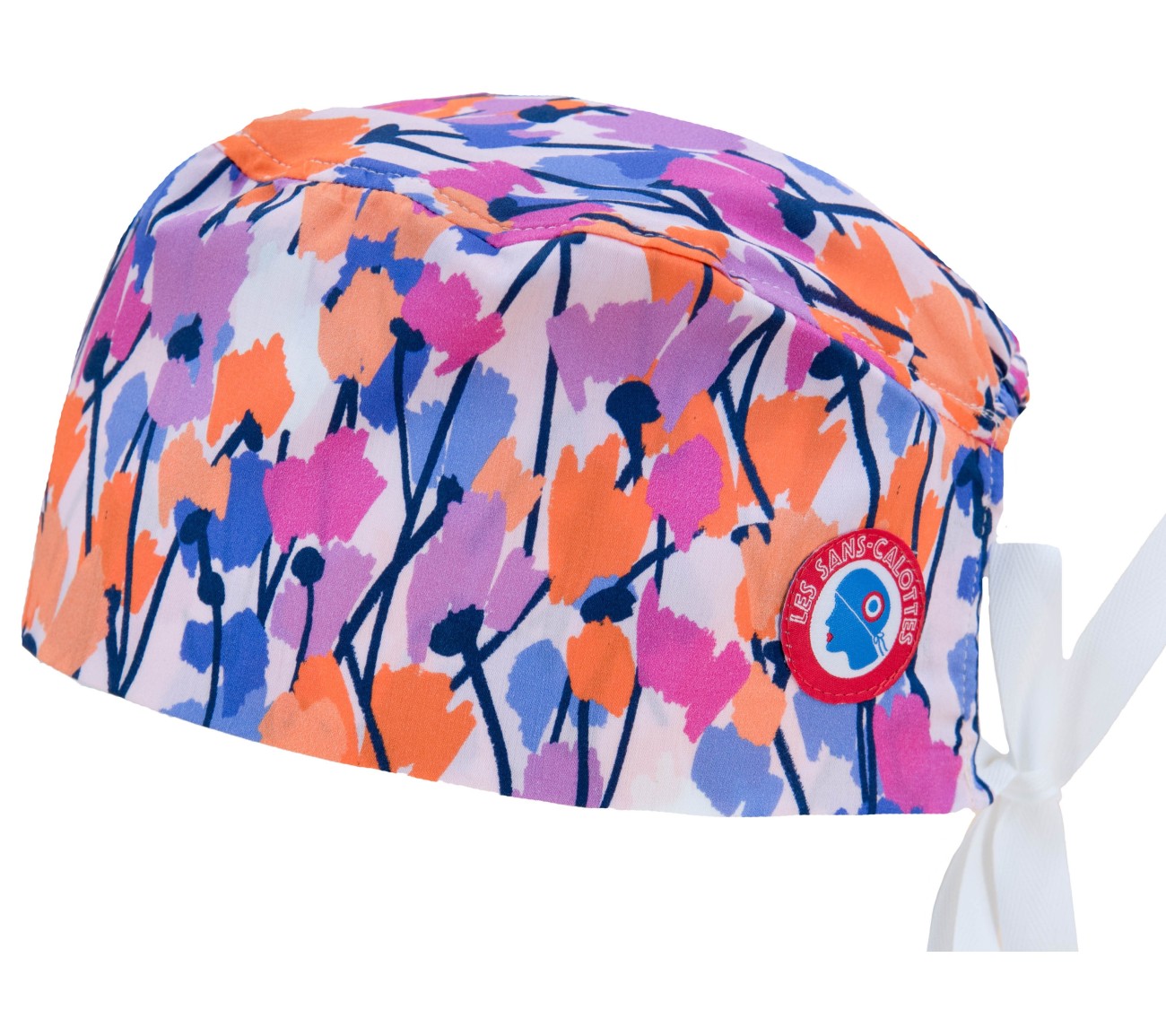 Calot fleuri en coton d'exception aux motifs floraux roses, oranges et mauves