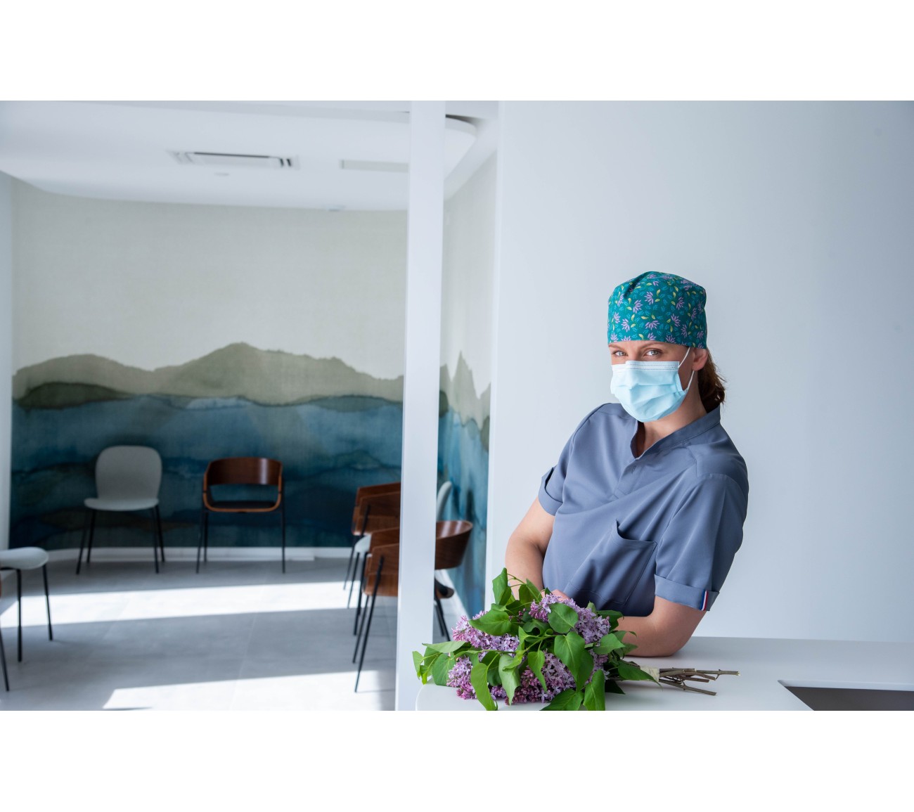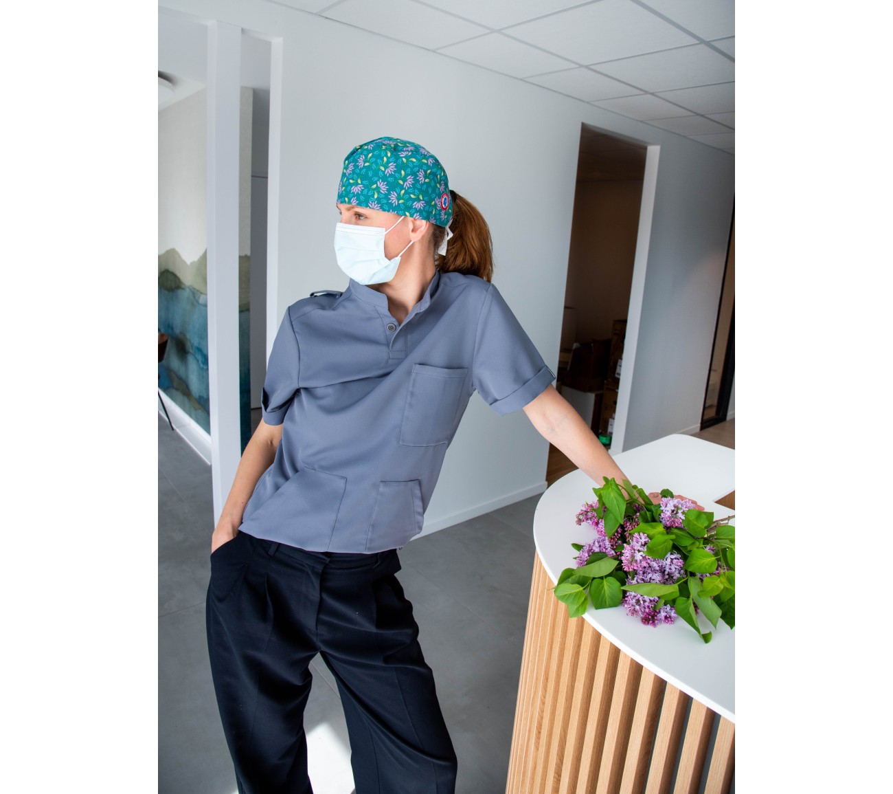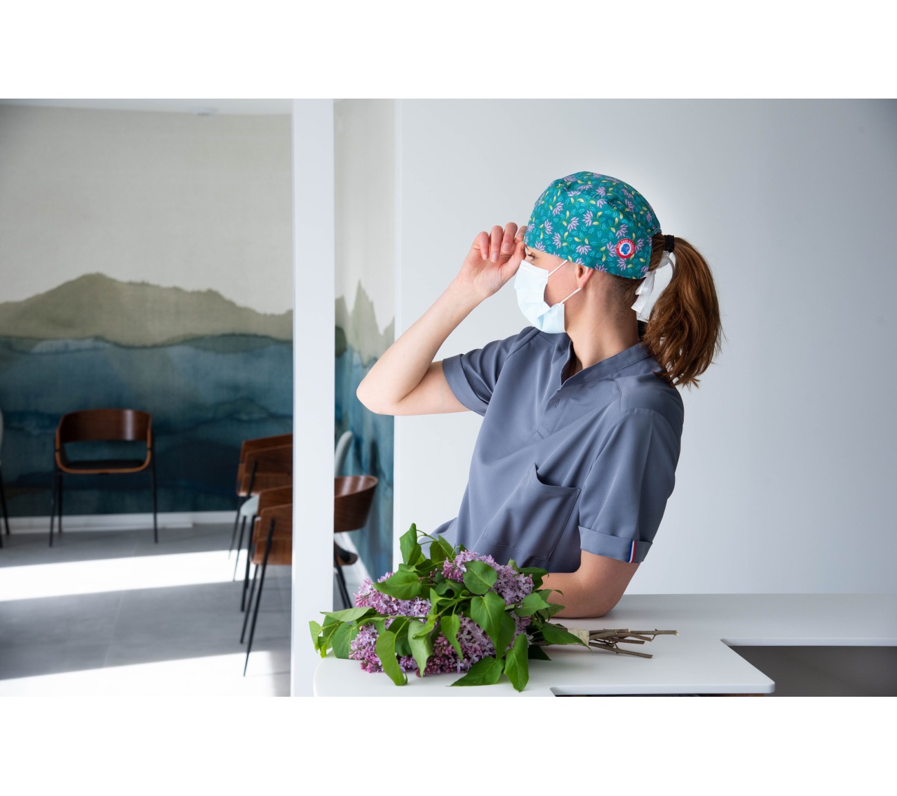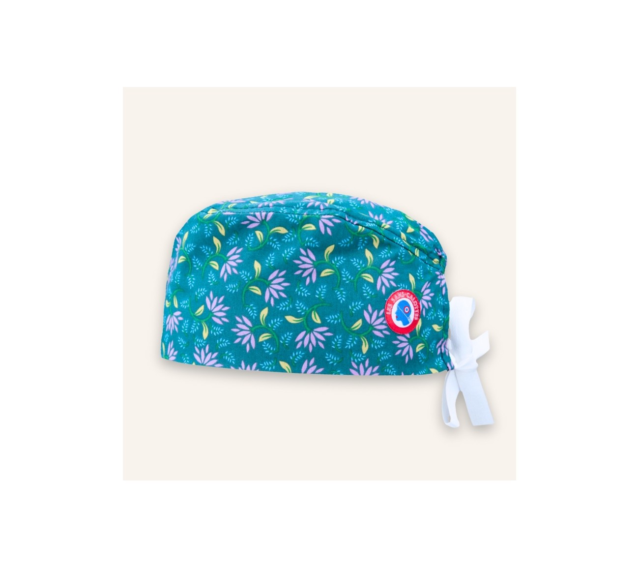 Calot en coton vert, aux motifs végétaux mauves, verts et bleus