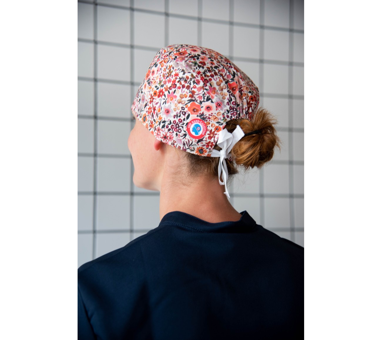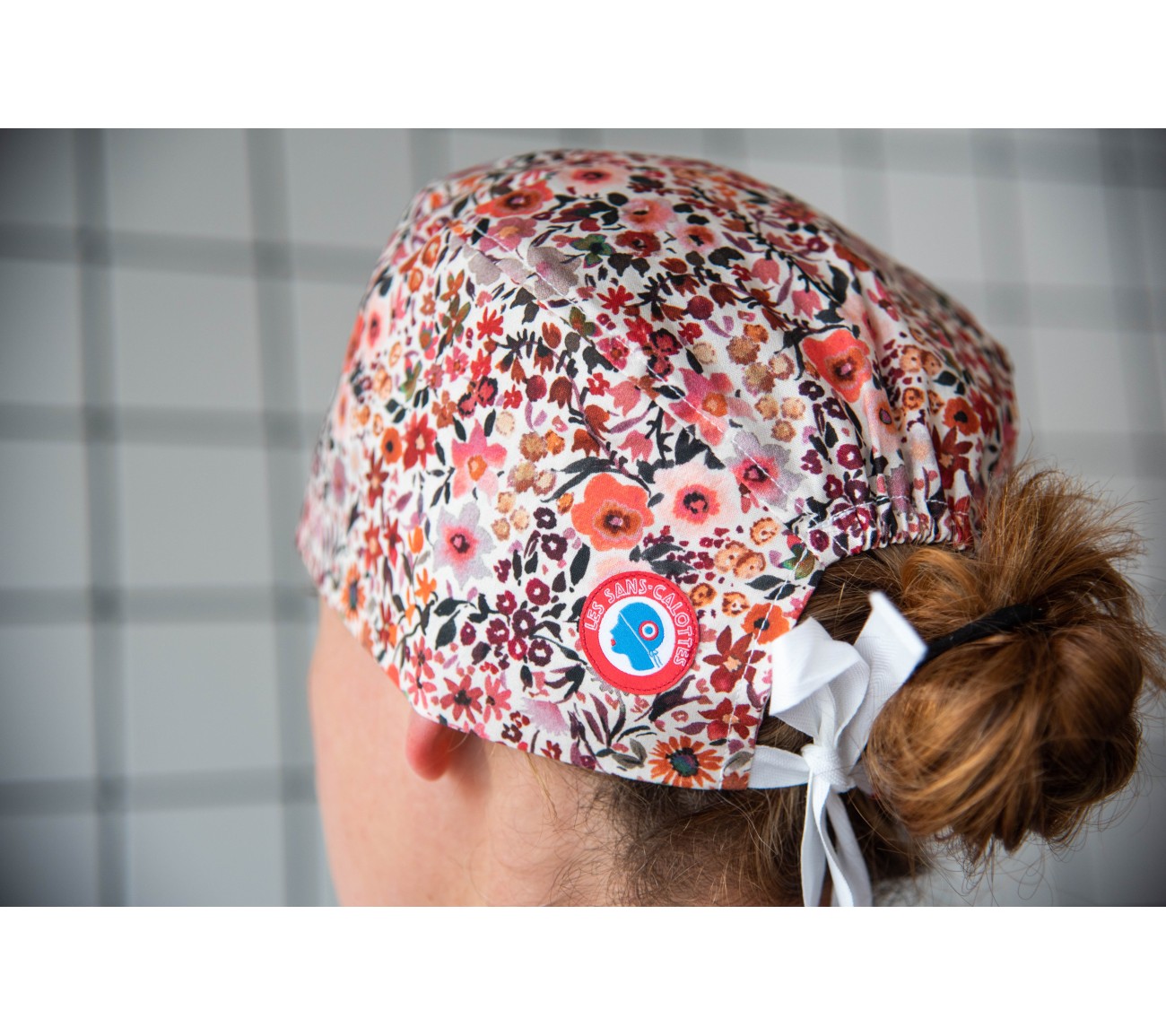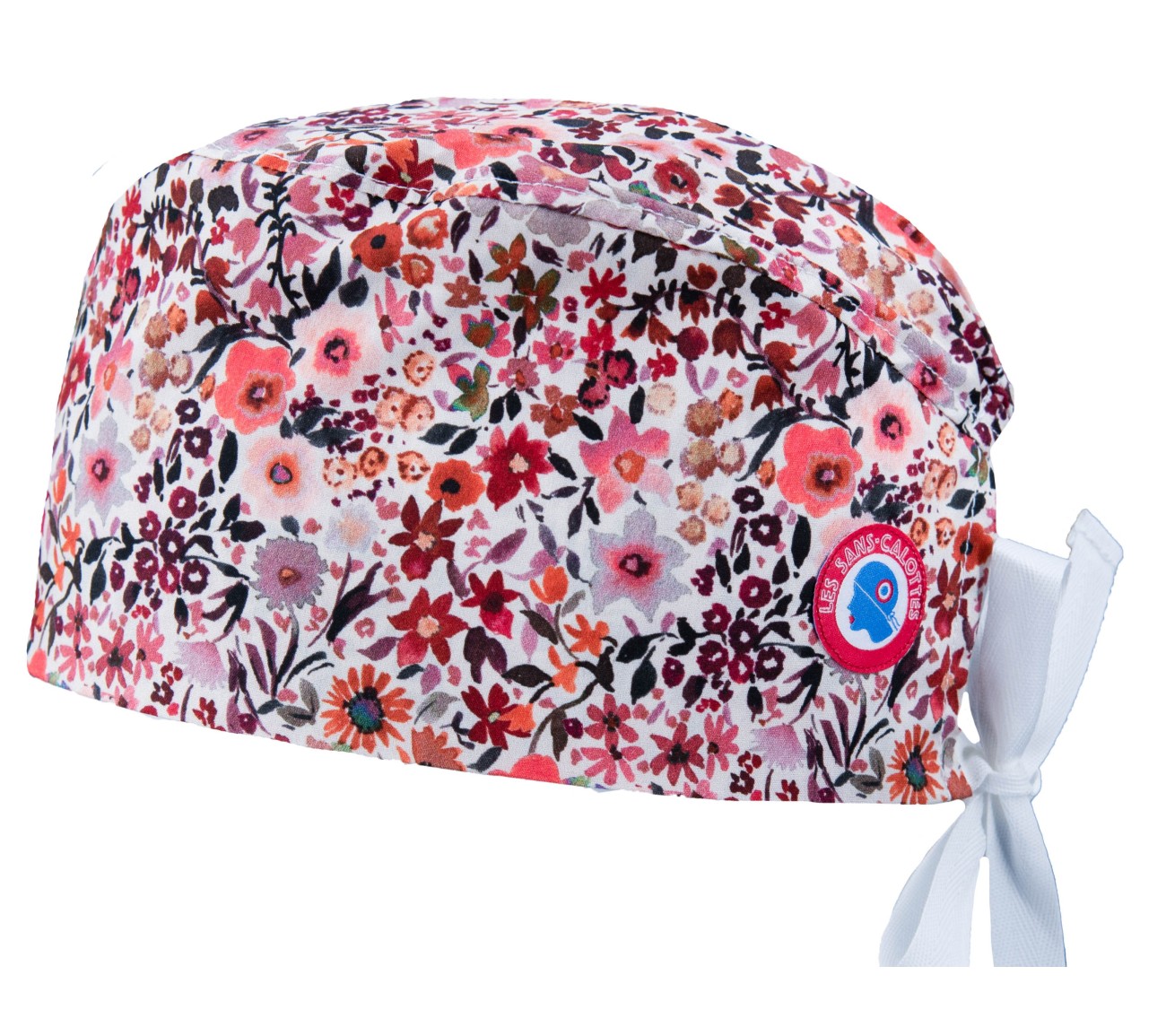 Calot en coton crème aux motifs fleuris dans les tons mauves, ocres et vieux rose