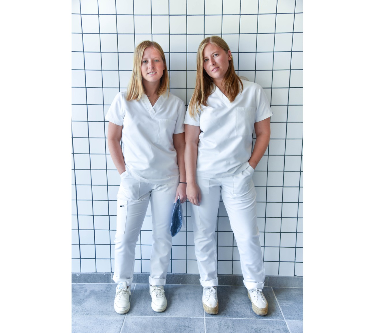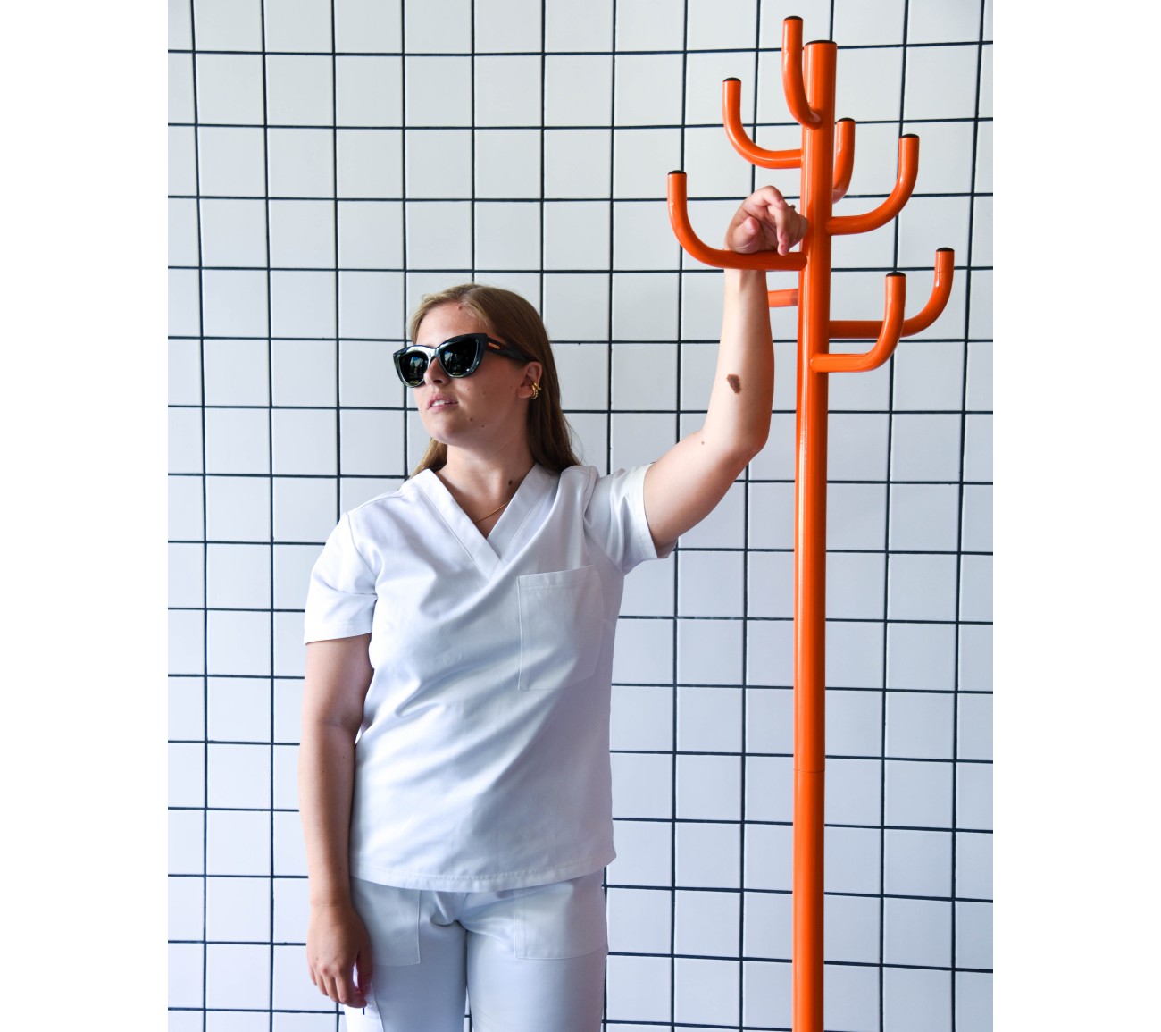 - Tenue Rose Pâle : Sarah, qui est orthodontiste, fait 1m72 et porte une taille S sur la photo. Elle porte habituellement du 36. Elle rentre aussi bien dans du S que du XS. Elle optera pour le S pour travailler en position assise au cabinet.