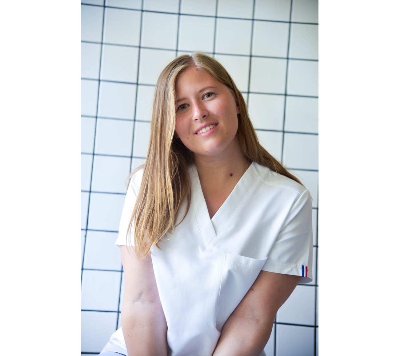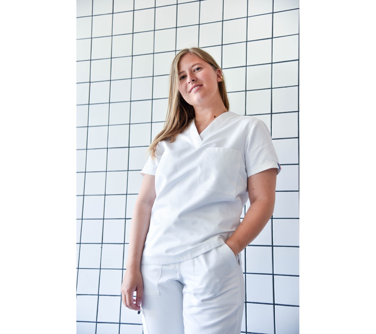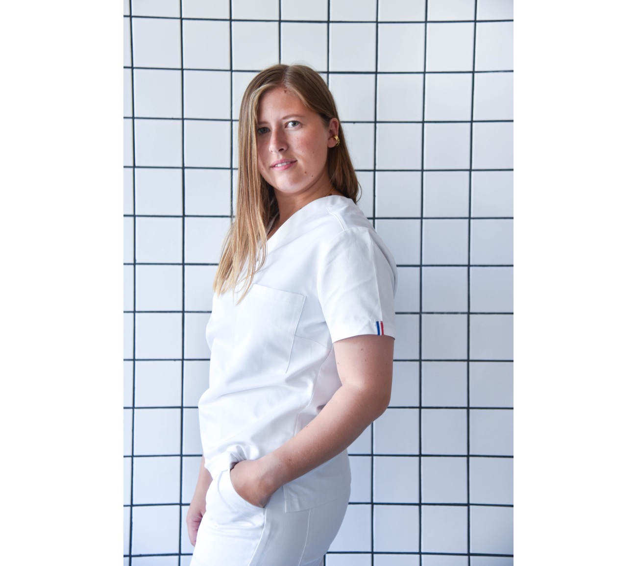 - Tenue Blanche : Clémence, qui est interne en dermatologie, fait 1m53 et porte une taille XS sur la photo. Elle porte habituellement du 34/36 et se sent à l'aise en XS pour ses stages en cabinet.