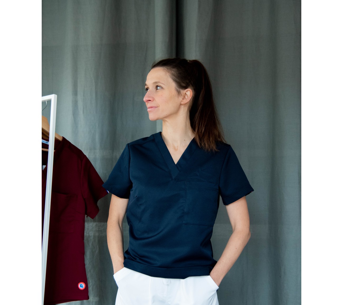 - Tenue Bordeaux : Sarah, qui est orthodontiste, fait 1m72 et porte une taille XS sur la photo. Elle porte habituellement du 36. Elle rentre aussi bien dans du S que du XS. Elle optera pour le S pour travailler en position assise au cabinet.