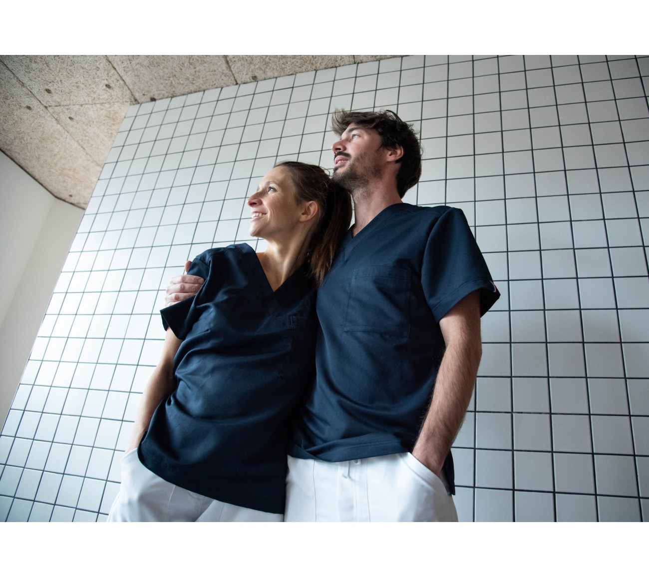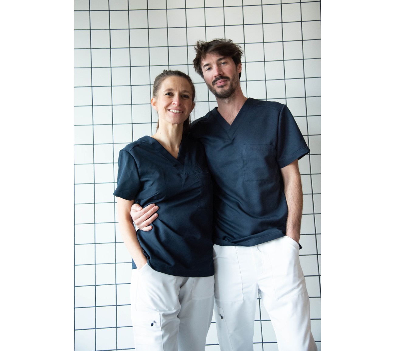 - Tenue Bleu Ciel : Sarah, qui est orthodontiste, fait 1m72 et porte une taille S sur la photo. Elle porte habituellement du 36. Elle rentre aussi bien dans du S que du XS. Elle optera pour le S pour travailler en position assise au cabinet.