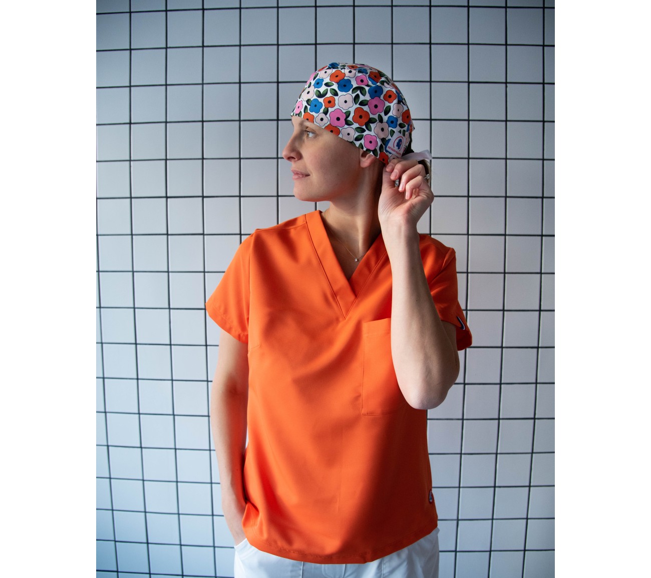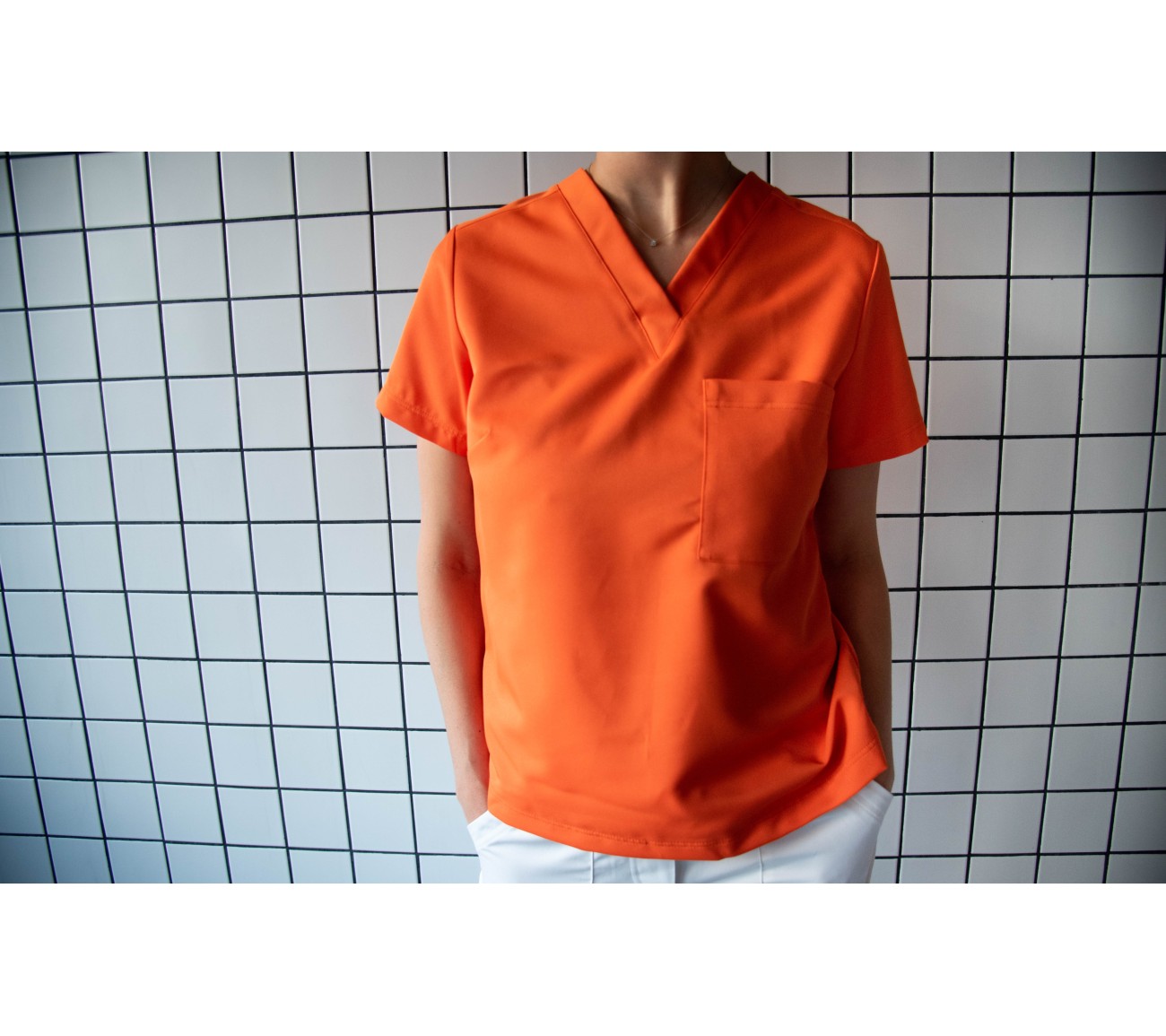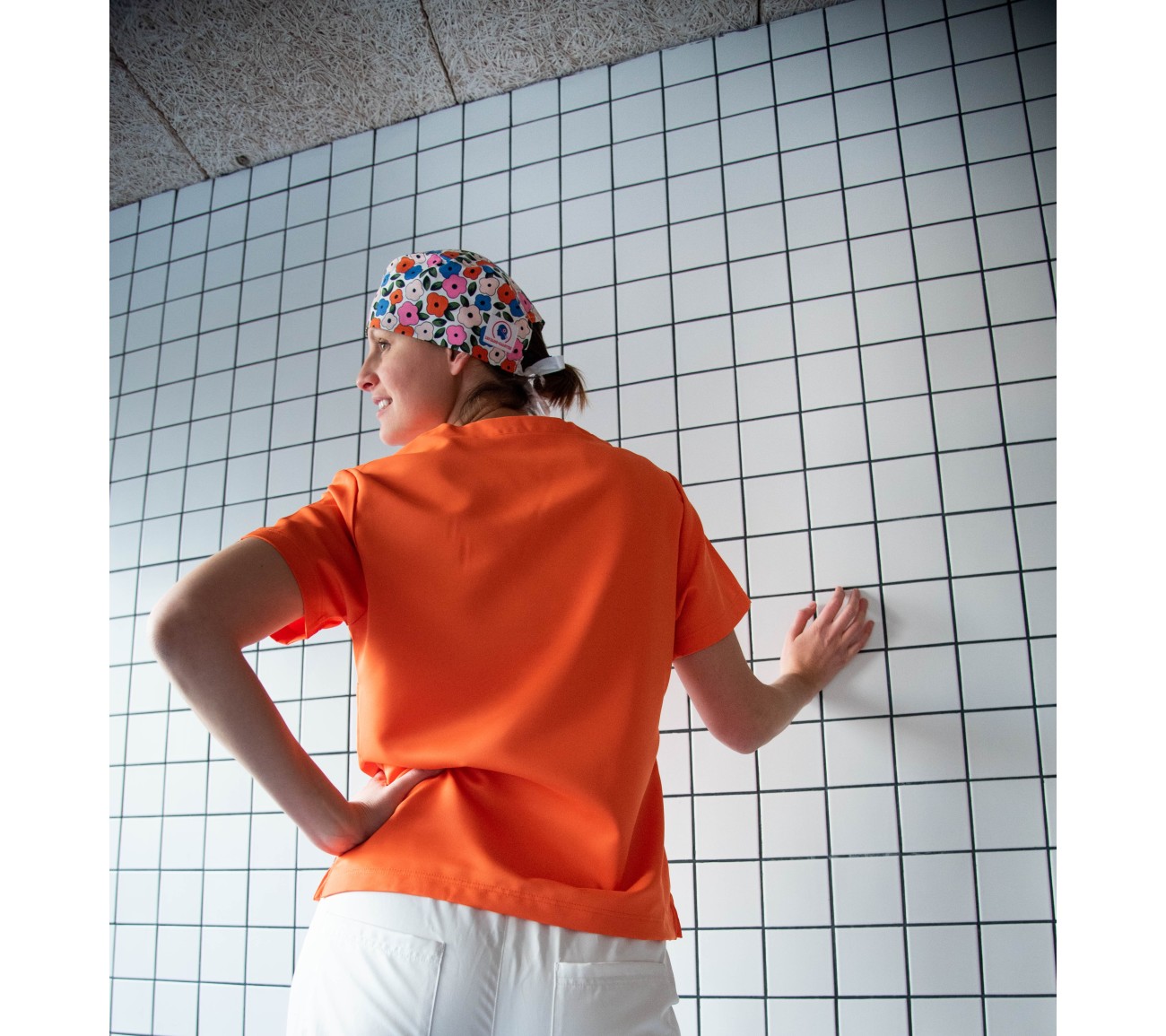 - Tenue Rose Pâle : Sarah, qui est orthodontiste, fait 1m72 et porte une taille S sur la photo. Elle porte habituellement du 36. Elle rentre aussi bien dans du S que du XS. Elle optera pour le S pour travailler en position assise au cabinet.