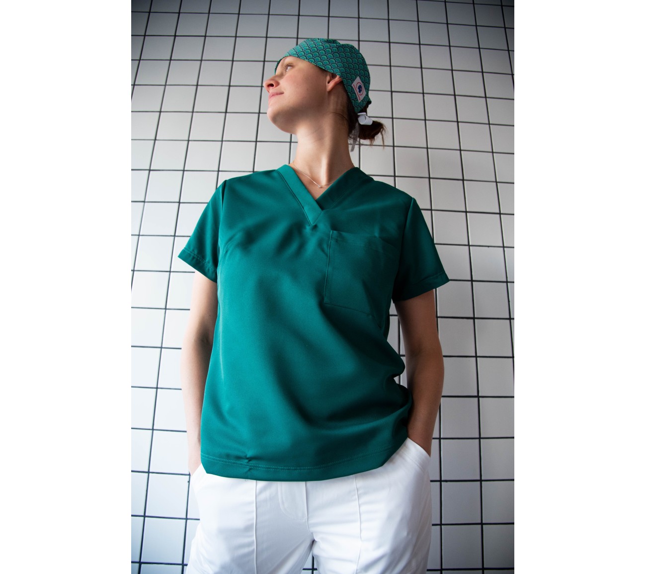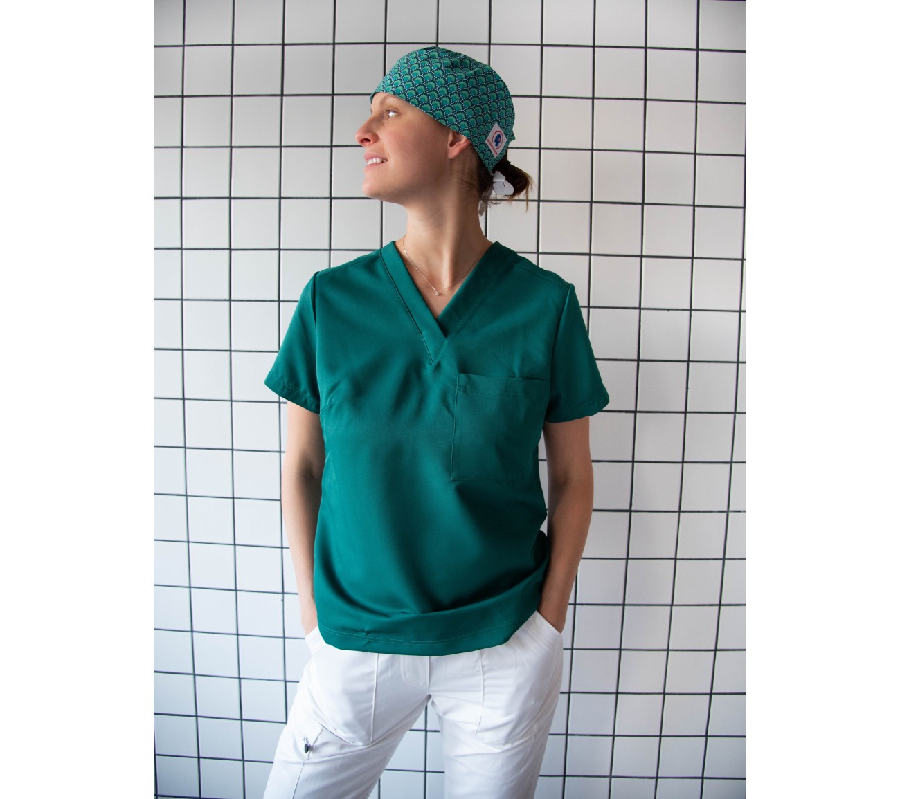 - Tenue Bleu Ciel : Sarah, qui est orthodontiste, fait 1m72 et porte une taille S sur la photo. Elle porte habituellement du 36. Elle rentre aussi bien dans du S que du XS. Elle optera pour le S pour travailler en position assise au cabinet.