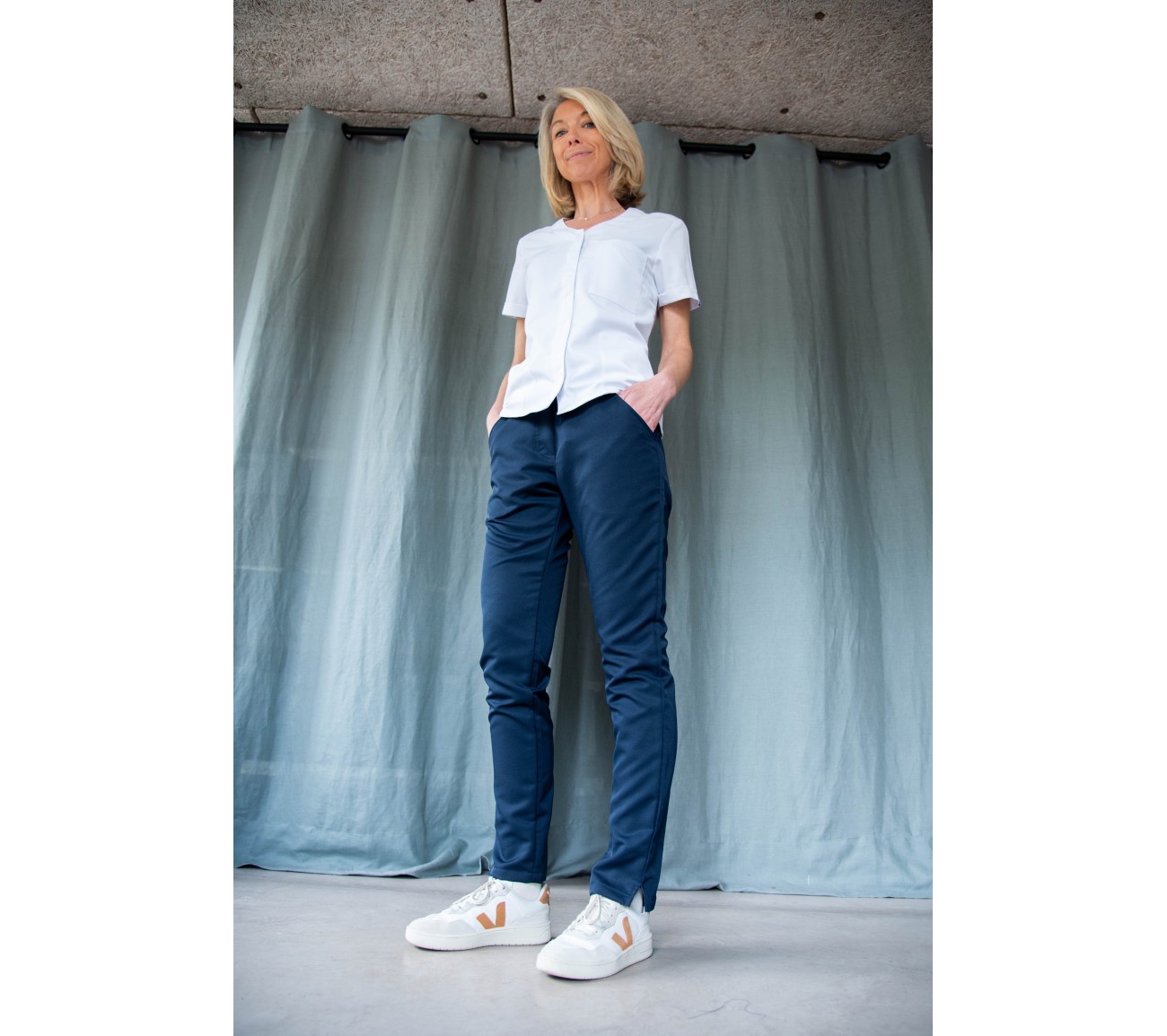 - Tunique blanche : Stéphanie, qui est dentiste, porte une tunique S et met habituellement du 36.